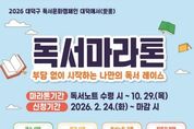 뉴한국방송뉴스통신사 신태공 기자 | 대전 대덕구가 주민들의 독서 습관 형성을 돕기 위해 ‘2026 독서마라톤’을 운영한다. 구는 24일부터 대덕구 공공도서관(석봉·안산·송촌도서관)에서 독서마라톤 참가자를 선착순으로 모집한다고 밝혔다. ‘독서문화캠페인 대덕애서’의 일환으로 추진하는 이번 사업은 연중 목표를 설정해 완주까지 이어가는 관리형 프로그램이다. 특히 참여자가 스스로 독서 목표를 설정하고 독서노트 기록을 통해 완주까지 이어갈 수 있도록 도서관이 ‘독서 러닝메이트’ 역할을 수행한다. 프로그램은 개인과 단체로 나뉘어 운영된다. 개인 참여자는 △15권 ‘동춘당 코스’ △20권 ‘계족산 코스’ △25권 ‘대청댐 코스’ 중 하나를 선택할 수 있으며, 3~7인으로 구성된 단체는 △40권 ‘대덕애서 코스’에 참여할 수 있다. 참가자는 제공 받은 독서노트에 감상문, 감상평, 인상 깊은 문장 필사 등 자유 형식으로 독후활동을 작성한 후 완성된 독서노트를 촬영해 네이버 밴드(Booking~ 대덕구 도서관)에 게시하고 도서관에 제출하면 완주가 인정된다. 제출된 독서노트는 완주증 수여 시 반