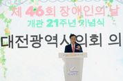 뉴한국방송뉴스통신사 신태공 기자 | 대전시의회 조원휘 의장은 9일 제46회 장애인의 날 및 유성구장애인종합복지관 21주년 기념식에 참석해 장애에 대한 편견을 허물고 지역 공동체의 결속을 다지는 계기를 마련했다. 이날 행사에는 장애인 가족과 자원봉사자, 후원기관 관계자 등 800여 명이 참석했으며, 식전공연을 시작으로 유공자 시상, 경품추첨, 기념품 증정까지 다채로운 프로그램으로 꾸며졌다. 조원휘 의장은 축사를 통해 "표창을 받으신 분들의 미소에서 대전의 희망을 보았다"며 "대전시민 100명 중 5명, 유성구에만 만 이천여 명의 구민이 장애와 함께 살아가고 계신다"고 말했다. 이어 "장애는 약 88%가 후천적 원인인 만큼, 장애인 복지는 특정 누군가의 문제가 아닌 우리 모두의 내일을 준비하는 일"이라고 강조했다. 또한 "여러분이 행복해야 대전이 행복하다"며 "시의회는 누구도 소외되지 않는 '평등한 대전'을 위해 든든한 동행자가 되겠다"고 밝혔다. [뉴스출처 : 대전시 대전시의회]